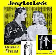 "Great Balls of Fire" is a 1957 popular song recorded by American rock and roll musician Jerry Lee Lewis on Sun Records[2] and featured in the 1957 movie Jamboree. It was written by Otis Blackwell and Jack Hammer. The Jerry Lee Lewis 1957 recording was ranked as the 96th greatest song ever by Rolling Stone. It is written in AABA form.[3] It sold one million copies in its first 10 days of release in the United States making it one of the best-selling singles in the United States at that time.
