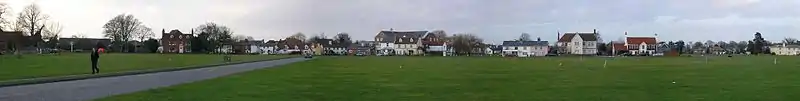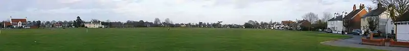 The village green covers some 43 acres (170,000 m2) and is reputed to be one of the largest in England. The village green was the site of a steam mill which was built in 1886. The mill chimney was demolished in 1925, and what remains of the structure today has been converted into apartments. Adjacent to the mill was a large pond which no longer exists, and a handful of willow trees mark the spot. To the north of the mill is a children's play area and a small nature reserve containing various species of grasses that can only be found in the local area.. To the east of this is the old mill house where a windmill once stood within the walled gardens of the house, but this was also demolished in the late 19th century.