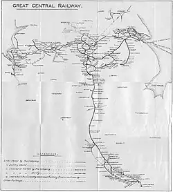 The Great Central Railway in England was formed when the Manchester, Sheffield and Lincolnshire Railway changed its name in 1897, anticipating the opening in 1899 of its London Extension.[2] On 1 January 1923, the company was grouped into the London and North Eastern Railway.