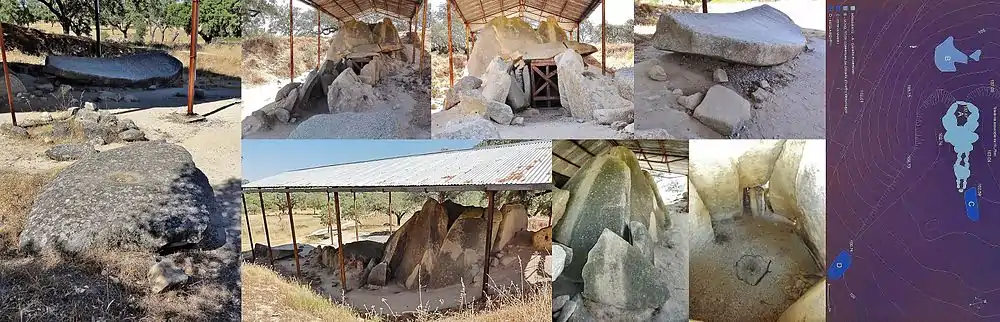 Consists of an irregular free-standing plan, composed of a single-chamber, articulated horizontal body with polygonal chamber and rectangular corridor.[2][1] The funerary chamber and access corridor are covered by size-specific slabs of rock: large granite slabs over the funerary chamber and smaller rock slabs on the entrance corridor.[2][1]