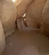 The remaining façades are obstructed by the observation mound, which still covers almost the entire structure except for the eastern side. The polygonal chamber, consisting of seven 8 metre-high pillars, is followed by smaller 2 metre-high slabs forming a 12 metre long (1.5 metre wide) corridor.[2][1] The 7 metre coverage slab (acting as a roof), lies broken on the mound, with a sag on its western edge.[2][1]