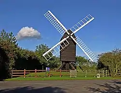 Great Gransden boasts the oldest post mill in England,[21][22] constructed around 1612 – though the claim is disputed by nearby Bourn. It has two storeys, with a flour-dressing machine, inscribed 1774 on the second floor. The mill ceased to operate about 1890. It was presented to the county council in 1950[23] and classified as an ancient monument in 1957. A restoration project was completed in 1984,[24] and a more thorough restoration began in 2015.[25][26] The mill still possesses its machinery. Newly constructed sails are due to be installed by 2022. It can be viewed inside by appointment.[27] A local legend claims a book of black magic entitled An Infidel's Bible was hidden in the mill in 1867, causing it to stop working. When the book was removed, the mill began to work again.[28]