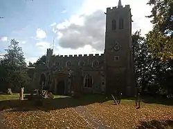 Great Gransden's older centre consists of cottages grouped round a 16th-century church, dedicated to Saint Bartholomew, whose tower dates from about 1390.[5] The connection between the village and Clare College, Cambridge appears to date from 1346, when the advowson for Great Gransden church parish formed part of the college's original endowment.[6][7]