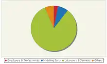 In 1831, the majority of males over the age of 20 (73% of employed males) were agricultural labourers. The next leading occupation, although only at approximately 6%, was males employed in retail and handicrafts.[10] Still in 1881, the majority of workers worked in agriculture, followed by general or unspecified commodities. At this time however, there are also records of females being employed although records show that the majority of females worked in an "unknown occupation." Many females also worked in dress or domestic services or offices.[11] According to the 2011 census, however, only 5 people were working in the agriculture, forestry and fishing industries. The three most popular employment categories were: professional, scientific and technical activities employing a total of 20 people, construction employing a total of 14 people followed by manufacturing providing employment for 11 people. This shows how the area and industry within the area has developed over the past 200 years.[12]