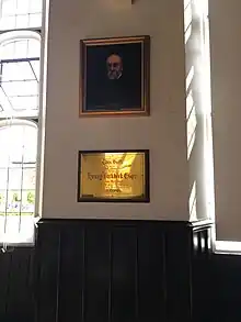 A plaque detailing the construction of Birkbeck Hall. The plaque reads 'This hall was built by many of his friends and admirers in memory of Henry Birkbeck Esqre of Stoke Holy Cross for many years chairman of this Hospital A.D 1901' The painting above is of Birkbeck