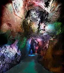 Great Masson Cavern is notable for its lack of stalactites and stalagmites, as the cave is coated in a clay-like substance that inhibits deposition. However, it still has some rock formations such as "the Owl" and "the Rabbit". It was first opened to visitor viewing in Victorian times and had been mined for fluorspar prior to the opening to visitors.[1]