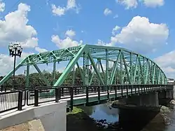 With time, however, the span became a bottleneck that figuratively split the city. Starting no later than the 1970s, people started talking about taking some sort of action, and the result was the construction of a similar bridge 150 feet (46 m) downstream of the original, begun in 2007.[1] The new bridge opened for traffic and the old one was closed for renovation on August 18, 2009. The area surrounding was improved with new sidewalks, lights, and pavement.[2] The upstream (1938) bridge carries three lanes of southbound traffic, and the downstream (2007) bridge carries three lanes northbound.[1] A small park lies between the approaches on both sides of the river.