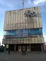 The Great Synagoge in Berehove in Ukraine, Zakarpattia Oblast was built in the late 19th century.[1] It was not destroyed during World War II and used as a synagogue until 1959, when it was confiscated by the Soviet authorities. The interior was converted into a theatre and cultural centre.[2] A concrete shell was built around the building; though the original building was kept intact, it could no longer be seen.[3] Today the front of it is covered with a huge drapery, showing a picture of the original front.