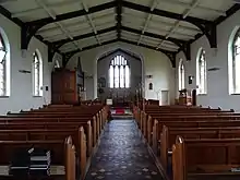 St Michael's Church (listed 1987), dating to 1833 and built by James Trubshaw on the site of a previous medieval church, is of limestone ashlar and comprises a chancel with vestry, nave and west tower. The buttressed chancel with polygonal pinacles, is listed as "short", and contains an east window in "15th-century style" by Heinersdorf of Berlin, and a vestry on its south side with internal and external access. The buttressed nave is of five bays with "13th-century-style" windows. Both chancel and nave are slate-roofed. The buttressed tower is of four stages; above its parapet rises an octagonal spire. At the west of the tower is the church main doorway portal, arched, and with hood mould with "carved head" label stops. The fourth stage is the belfry with abat-sons, and a ring of six bells, three originals dating to 1689, and three recast in the 18th and 19th century. The nave interior includes an 1876 pipe organ by Charles Martin of Oxford at the corner of the north wall and chancel arch, a wooden pulpit and reading desk, and an octagonal stone font, and late 17th or early 18th-century marble tablet memorials to the Ingram's family.[3][24][19][25][26] In the churchyard to the east of the chancel is a 1698 headstone (listed 1987), limestone, with a panel with "carved drapery surround" and dated inscription.[27]