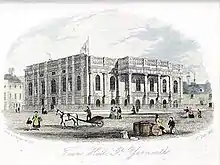 In medieval times the main civic building in the town was the Tolhouse which had been completed in 1150.[2] A dedicated town hall, designed in the neoclassical style with a full-height tetrastyle portico, was built on the quayside and completed in 1716.[3] The principal room inside was the dining room which contained a portrait by James Worsdale of King George II and a wooden scale model of the Britannia Monument.[4] A lock-up for petty criminals was erected at the back of the town hall in 1842.[5]