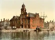 In the 1870s civic leaders decided to demolish the old town hall and commission a new town hall on the same site: the foundation stone for the new building was laid by the mayor, Councillor Charles Cory Aldred, on 20 April 1880.[6] It was designed by John Bond Pearce in the Queen Anne Revival style, was built with terracotta facings and was officially opened by the Prince of Wales on 31 May 1882.[1][7][8]