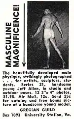 The cover of the first issue of Grecian Guild Pictorial showed the head of Myron's sculpture of a discus-throwing youth against a pink background. Early issues contained a number of commentaries on Greek statuary, and editorial content frequently expressed an admiration of Ancient Greek society, which was "wiser and more sophisticated" than today, and where "the body of a muscular, graceful, well-proportioned youth was among the most admirable of all things."[15] In his views on homosexuality and Ancient Greece, Benson was influenced by Sexual Life in Ancient Greece by German scholar Paul Brandt, which was then the most authoritative source on homosexuality in the ancient world; Benson often quoted Brandt in the editorial content he wrote for Grecian Guild Pictorial.[16]