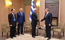 On 7 December 2018, Greek Prime Minister Alexis Tsipras went to Russia on a working visit, his first visit there in three years.[22] After talks with Vladimir Putin, both leaders expressed hope that the spat between the two countries was in the past, bilateral agreements were signed and international issues like the Cyprus dispute were discussed.[23][24][25][26] Tsipras said that he had expressed to Putin his concern at Turkey buying advanced weapons, such as S-400 missile systems, from Russia.[27][28] Experts noted that Greek-Russian relations were not as they had been prior to the spat because of the growing importance of Greece's strategic military ties with the US, and military co-operation between Russia and Turkey was increasing.[29] On 13 December 2018, in Washington, D.C., the Greek Foreign Minister and the American Secretary of State formally launched what they called "the inaugural U.S.-Greece Strategic Dialogue",[30][31] which Greek Acting Foreign Minister Georgios Katrougalos characterised as ″a procedure that shows the upgrading of our relations with that country″[32] and ″the apex of our bilateral relations″.[33]