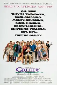Greedy is a 1994 American comedy film directed by Jonathan Lynn, written by Lowell Ganz and Babaloo Mandel, and starring Michael J. Fox, Kirk Douglas, Nancy Travis, Olivia d'Abo, Phil Hartman, Ed Begley Jr., and Colleen Camp. It tells the story of an aging wheelchair-using scrap metal tycoon whose younger relatives compete to get the inheritance when he dies.