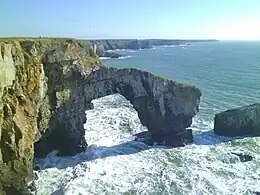 The Green Bridge of Wales (Welsh: Pont Werdd Cymru) is a natural arch formed from Carboniferous Limestone within the Pembrokeshire Coast National Park, Pembrokeshire, Wales. It is located in the Castlemartin military training area just beyond the car park at Stack Rocks (Creigiau Elegig) and beside the Pembrokeshire Coast Path.[1]