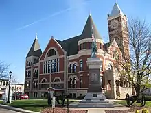 Architect G. Stanley Mansfield, a courthouse architect who also planned the Clinton County Courthouse in Iowa, designed the Richardsonian Romanesque courthouse. The two-and-one-half story building is built from red brick and limestone, the typical building materials of Romanesque architecture. A 120-foot (37 m) clock tower rises from the southwest corner of the building; smaller towers mark the other three corners. Limestone porches on the east and west sides cover the courthouse's two main entrances. Both the entranceways and the north and south sides' windows feature heavy limestone arches, a common Romanesque feature. The courthouse occupies a courthouse square which it shares with a Civil War memorial; the square is surrounded by Monroe's downtown commercial district.[2]