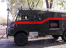 A Green Goddess emerging from Wellington Barracks in November 2002 during the 2002–2003 industrial dispute.
