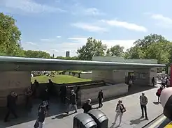 The station was busy and unsuccessful attempts to control crowds with gates at platform level were made in 1918. In the 1930s, the station was included amongst those modernised in conjunction with the northern and western extensions of the Piccadilly line. A new sub-surface ticket hall was opened on 18 September 1933 with a pair of Otis escalators provided to replace the lifts.[30] The new ticket hall was accessed from subway entrances in Piccadilly. On the north side, an entrance was provided in Devonshire House on the corner with Stratton Street; on the south side an entrance was constructed on a piece of land taken from the park.[27] The shelter for the southern entrance was designed by Charles Holden.[31][lower-alpha 5] The original station building, the lifts and the redundant below-ground passages were closed and the station was renamed Green Park. Part of the ground floor was used as a tea shop until the 1960s.[27] In 1955, a third escalator was added to help deal with increased passenger numbers.[33]