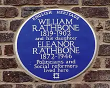 The property has been marked by an English Heritage Blue Plaque since 29 July 2001, which honours Eleanor Rathbone (1872–1946), suffragist and pioneer of the state-funded family allowance, and her father, social reformer William Rathbone VI (1819–1902), who created the first system of district nursing.[10] The plaque was unveiled by William Rathbone X in 2001.[11]