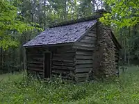 The Baxter/Jenkins Cabin, located near the junction of the Old Settlers Trail and the Maddron Bald Trail, was built by Willis Baxter and his son, William, in 1889. The cabin was originally a wedding gift to William and was passed on to Willis' second son, Alex, when William's wife inherited property in Cosby. Chandler Jenkins was a later owner. The farm originally included two cabins, a barn, corn crib, smokehouse, hog pen, chicken house, and blacksmith shop, but this cabin and the chicken house are all that remain. In the 1950s, the chicken house was moved to the Mountain Farm Museum at Oconaluftee.[38]