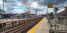 The station has two high-level side platforms. The north platform, next to the main track, is 12 cars long. The south platform, next to the siding, is eight cars long, and is not in use.[7] There is also a pedestrian bridge connecting the two platforms.[7] On either ends of the station, the two tracks merge into one.
