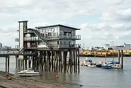 The current clubhouse complex was designed by Fankl and Luty[7] and was completed in 1999.The clubhouse is the only building built in the Thames itself being raised upon stilts above the waters below,[8] and is open to the public each year[9] as part of the London Open House.[10] The complex includes an engineering/machining facility, sailoft, woodworking facility, an indoor work area with a capacity for two or more boats, a wedding and conference venue,[11][12] plus a three-storey clubhouse situated on a dolphin in the tidal Thames reached by a bridge from landside. The complex is disabled access friendly.[13]