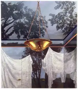Drasler created enigmatic, Magritte-like formal and psychological puzzles in paintings such as Changing Room (1994), whose surreal trompe-l'œil draped sheets, mirror reflections and painted landscape mural camouflage both architecture and purpose.[36][1] Robert G. Edelman suggests these paintings slowly reveal "wry and portentous secrets" like Velázquez's Las Meninas or De Chirico's piazzas, which similarly resist resolution.[36] In other paintings, such as Restless Bedroom (1992), Drasler conveys a more animate spirit with enveloping swaths of fabric or nature motifs that blur boundaries between organic and man-made, inside and outside, and figure and ground.[14][1][11] He also introduced suspended common objects (a tomato pincushion in Green Room, 1995; linked hangers in Mobile, 2001) and symbolic wallpaper patterns into his work (a bluebird and birdcage, beehive, and ball and chain in Facts of Life, 1995) that allude to psychosexual dramas to untangle.[14][37]