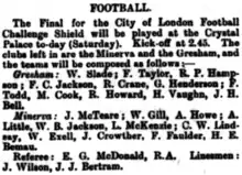 Line-ups for the 1896 City of London Challenge Shield final between Minerva and Gresham, which Minerva won 4-0
