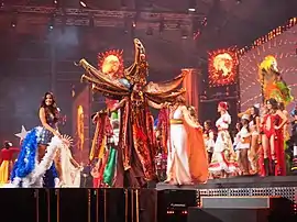 Gresya brought a national costume with the Torajan Tongkonan-inspired ensemble,[18][19][20] Tongkonan is the traditional ancestral house, or Rumah adat of the Torajan people, in South Sulawesi, Indonesia. Tongkonan have a distinguishing boat-shaped and oversized saddleback roof.[21][22] The costume named "Mystical Toraja" designed by Jember Fashion Carnival.[18][19][20] Asha Bhat of India crowned Stephania Stegman of Paraguay as the new titleholder at the end of the event.[43]