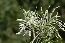 Spiny cream spider flower grows in heath, shrubland and mallee, sometimes near creeks and occurs between Southern Cross, Lake Grace, Zanthus and Cape Arid in south-western Western Australia, on the Eyre Peninsula in South Australia and around Griffith in New South Wales.[3][4][5]