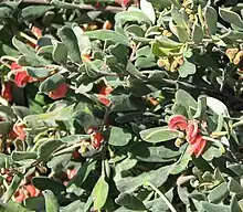 Grevillea arenaria is an erect to spreading shrub that grows to a height of 0.3–4 m (1 ft 0 in – 13 ft 1 in). The leaves are elliptic to egg-shaped with the narrower end towards the base, 15–75 mm (0.59–2.95 in) long and 3–15 mm (0.12–0.59 in) wide with the edges turned down or rolled under. The flowers are arranged in groups of two to six on the ends of short side branches along a rachis 1–10 mm (0.039–0.394 in) long, and are red, pink or orange and hairy. The pistil is 24–32 mm (0.94–1.26 in) long and the ovary is sessile. Flowers are present in most months with a peak in spring.[5][6]