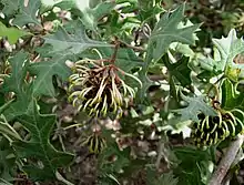 Grevillea dryophylla is a spreading to erect shrub that typically grows to a height of 0.3–1.5 m (1 ft 0 in – 4 ft 11 in) and has hairy branchlets. Its leaves are 20–85 mm (0.79–3.35 in) long and 20–70 mm (0.79–2.76 in) wide in outline, and usually have three to seven lobes 6–30 mm (0.24–1.18 in) long and 5–20 mm (0.20–0.79 in) wide, occasionally simple or with two to five teeth. The tips of the teeth or lobes are usually sharply pointed, the edges are turned down and the lower surface in covered with wavy to curly hairs. The flowers are arranged in groups on a rachis 10–40 mm (0.39–1.57 in) long and are green to light brown or dull yellow, the pistil 13.5–15.5 mm (0.53–0.61 in) long with a glabrous red to pink or dull yellow style. Flowering occurs from August to November and the fruit is a glabrous, silky-hairy follicle 9–12.5 mm (0.35–0.49 in) long.[2][3]