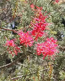 Grevillea georgeana is a species of flowering plant in the family Proteaceae and is endemic to inland areas of south-western Western Australia. It is an erect to widely spreading shrub with deeply divided leaves, the end lobes linear and sharply pointed, and scarlet to bright reddish-pink and cream-coloured flowers.