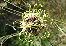 Grevillea globosa is a spreading shrub that typically grows to a height of 1–3 m (3 ft 3 in – 9 ft 10 in) but does not form a lignotuber. Its leaves are erect 80–180 mm (3.1–7.1 in) long and deeply divided with three to nine usually linear lobes, 0.5–1.0 mm (0.020–0.039 in) wide with the edges rolled under, concealing all but the prominent midvein. The flowers are arranged in dense, spherical groups in leaf axils or on the ends of branches on a hairy rachis 5–8 mm (0.20–0.31 in) long. The flowers are pale green to whitish, creamy-green and hairy, turning black as they age, the pistil 13–22 mm (0.51–0.87 in) long, the style greenish. Flowering occurs sporadically throughout the year and the fruit is an oblong follicle 9–12.5 mm (0.35–0.49 in) long.[4][2]
