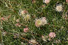 - Grevillea hakeoides Meisn. subsp. hakeoides[8] has more or less cylindrical leaves usually 30–50 mm (1.2–2.0 in) long and 0.5–0.8 mm (0.020–0.031 in) wide, and greenish-white to creamy-grey or pinkish flowers;[9]