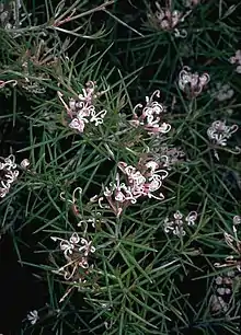Grevillea halmaturina is a species of flowering plant in the family Proteaceae and is endemic to South Australia. It is a prickly, spreading to erect shrub with sharply-pointed, linear to more or less-cylindrical leaves and large groups of white to pale pink flowers.