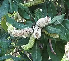Grevillea hilliana is a tree that typically grows to a height of 8–30 m (26–98 ft). Young plants usually have divided leaves, mostly 250–400 mm (9.8–15.7 in) long and 150–300 mm (5.9–11.8 in) wide with three to ten linear to lance-shaped lobes 80–250 mm (3.1–9.8 in) long and 10–50 mm (0.39–1.97 in) wide, the lower surface silky-hairy. Adult leaves are lance-shaped to oblong, 90–240 mm (3.5–9.4 in) long and 15–60 mm (0.59–2.36 in) wide, or sometimes divided with four to six oblong to egg-shaped lobes 60–120 mm (2.4–4.7 in) long and 20–40 mm (0.79–1.57 in) wide and silky-hairy on the lower surface. The flowers are arranged in large, cylindrical groups 80–220 mm (3.1–8.7 in) long and are white to pale green, the pistil 13.5–16 mm (0.53–0.63 in) long and glabrous. Flowering mainly occurs from July to October, often in other months, and the fruit is a glabrous, oval to elliptic follicle 17–26 mm (0.67–1.02 in) long.[2][3][4][5]