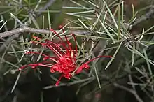 Grevillea phillipsiana is a prickly, spreading to erect shrub that typically grows to a height of 0.8–1.5 m (2 ft 7 in – 4 ft 11 in) and has linear or tapering leaves, 10–35 mm (0.39–1.38 in) long and 0.8–1.4 mm (0.031–0.055 in) wide. The edges of the leaves are rolled under enclosing most of the lower surface and the upper surface has ridges along its length. The flowers are usually arranged on the ends of branches in clusters of 2 to 14 on a silky-hairy rachis 1–4 mm (0.039–0.157 in) long. The flowers are red, the pistil 22–28 mm (0.87–1.10 in) long. Flowering occurs from July to September and the fruit is a narrowly oval follicle about 15 mm (0.59 in) long.[2][3]