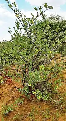 Grewia flava, the brandy bush, wild currant, velvet raisin, or raisin tree, is a species of flowering plant in the family Malvaceae, native to southern Africa.[2] A common shrub species, it is spreading into grasslands due to human rangeland management practices, and increasing rainfall.[3] The berries are sweet and edible, but have little flesh and so are typically collected to ferment into alcoholic beverages.[4] The desert truffle Kalaharituber pfeilii is often found in association with its roots.[4]