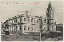 In the early 1900s the council had approved the building of a new town hall and council offices, however the cost was prohibitive. After applying to Andrew Carnegie for funds to add a library wing to the building, a grant of £2250 was received in 1906.[3] The building, designed by architect Edward Iveagh Lord, was the largest brick building on the West Coast, and had a 21.5 metres (71 ft) clock tower.[1]