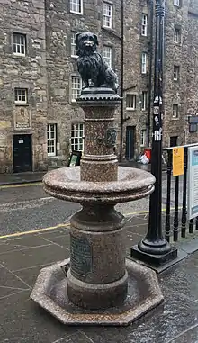 The Greyfriars Bobby Fountain is a granite fountain in Edinburgh, surmounted by a bronze life-size statue of Greyfriars Bobby, a Skye Terrier who became known in 19th-century Edinburgh for supposedly spending 14 years guarding the grave of his owner John Gray until the dog itself died on 14 January 1872.