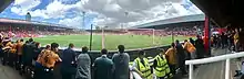 - New Road Stand – A single-tiered all-seated stand located along the New Road.[49] During its final years it was officially named the Bill Axbey Stand, as a tribute to the club's oldest-ever supporter.[54] The away supporters' section was housed in the northwest corner of the stand until October 1991.[55] Previously a terrace, the stand was converted to seating during the 1996 off-season.[1] In 2010, at the request of then-manager Andy Scott, the dugouts were relocated in front of the stand.[56][57] The central camera position for TV broadcasts of games was located in a gantry suspended from the roof of the stand.[58] The Family Section was located in blocks N506, N507 and N508.[26]