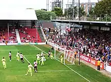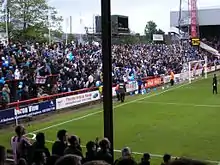 - Braemar Road Stand – A two-tiered all-seated stand located along the Braemar Road,[49] with the lower tier being known as 'the Paddock'.[50] The stand also housed the dressing rooms, supporters' bar and club offices.[51] The stand's forecourt housed the club shop and ticket office.[52] Until 2010, the dugouts were located in front of the stand.[53]