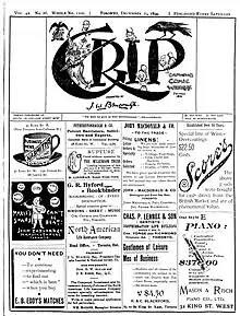 Grip's first issue was released on May 24, 1873.[1] The magazine's title was taken from the name of a raven in Barnaby Rudge, a novel by Charles Dickens.[1] Its weekly circulation peaked at approximately 7,000 copies per week.[2] Ramsay Cook argues that the magazine first entered mainstream consciousness during the Pacific Scandal.[3]