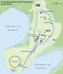 The Groß Raden Archaeological Open Air Museum (German: Archäologische Freilichtmuseum Groß Raden) lies a few kilometres north of the small town of Sternberg and about a kilometre northeast of the village of Groß Raden in the German state of Mecklenburg-Vorpommern. The site is in a depression that borders directly onto the lake of Radener See. On a peninsula in front of that lies its circular castle rampart, visible from afar, which has a diameter of 50 metres. From 1973 to 1980 extensive excavations were carried out here, led by Ewald Schuldt, during the course of which the remnants of a Slavic settlement dating to the 9th and 10th centuries was unearthed. The fort has been reconstructed based on the excavations and established as an archaeological open-air museum. It has been enhanced by finds from the Slavic castle of Behren-Lübchin.