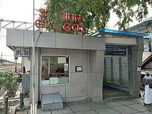 Grogol Station (GGL) (Indonesian: Stasiun Grogol) is a railway station in Jelambar, Grogol Petamburan, West Jakarta. It is the second station on the Duri-Tangerang branch line Brown Line service. The station is a strategic point for students as it is located within close proximity of Trisakti University and the University of Tarumanegara.