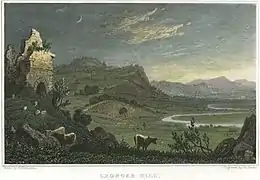 During the 19th century there were two translations of Dyer's celebration of the Welsh countryside at the tail end of the Welsh literary renaissance. The first was the “Duoglott Poem, faithfully imitated” as Twyn Grongar by Rev. Thomas Davies in 1832.[27] A second, Bryn y Grongaer, was written by William Davies (1831–1892) under his bardic name of Teilo.[28] The site itself was painted early in the century by Henry Gastineau and later appeared as a woodcut in Wales Illustrated (1830).
