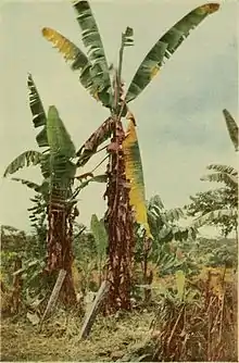 Gros Michel (French pronunciation: [ɡʁo miʃɛl]), often translated and known as "Big Mike", is an export cultivar of banana and was, until the 1950s, the main variety grown.[3] The physical properties of the Gros Michel make it an excellent export produce; its thick peel makes it resilient to bruising during transport and the dense bunches that it grows in make it easy to ship.[4]
