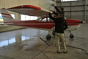In most cases ground-based deicing is accomplished by spraying the aircraft with an aircraft deicing fluid just prior to departure. For commercial aircraft this fluid is usually applied to contaminated surfaces using a specially designed machine. For smaller aircraft a handheld spray applicator may suffice.
