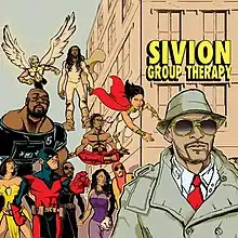 Sivion described Group Therapy as a "guest album", because of the multitude of guest artists on the album, almost thirty features.[6] Sivion's day job in the healthcare staffing industry made him familiar with the term "group therapy", which he opted to use as the number of guest features on the album increased.[7] The concept behind this title is that the group of Christians coming to the rescue of non-Christians. This also inspired the album cover, which features the various guest artists as superheroes. Sivion says that "All these superheroes are trying to figure out what it is about this guy that makes him have superpowers when he’s not a superhero."[7] Sivion says that the point of this is that God is the source of his power, and God is greater than anything else. The cover depicts, clockwise from top left: Sintax the Terrific, Propaganda, Zane One, Wushu, Sivion, Krum, Eimi Hall, Sareem Poems, Manchild, Heather James, and Freddie Bruno.[7] Lamar Gibbs from Jam the Hype! in their review of the album said that the content of the album itself did not communicate the concept, but the list of features and producers in the track listing made them clear.[8]
